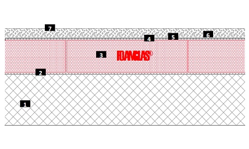 Sur le support préparé, une membrane d’étanchéité  en bitume polymère a été collée au bitume chaud. Cette couche est conçue pour reprendre l’effort de traction lié à la flottabilité du verre cellulaire. L’isolation en verre cellulaire a par la suite été installée également collée en plein au bitume chaud y compris les joints les rendant étanches. Une seconde membrane a été installée au moyen du bitume chaud sur le verre cellulaire. Un enduit d’étanchéité minérale remonte en périphérie contre les murs sur une hauteur de 70 cm. Une protection en asphalte coulé en 2 couches permet d’obtenir après plusieurs ponçages un « sol terrazo »